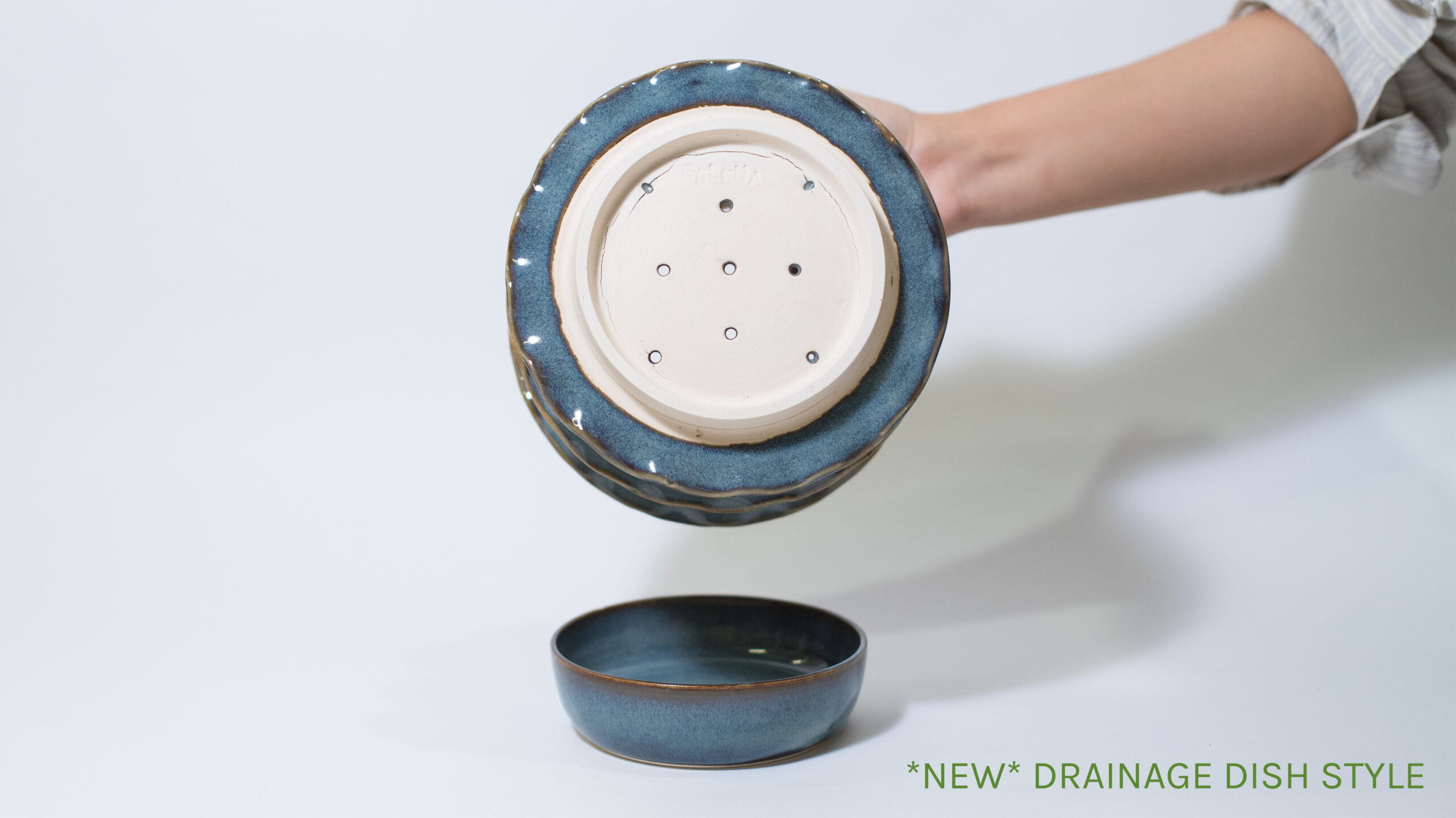 Seconds* for NEW Drainage Dish Style: Crack in the bottom of the main plant body (not all the way through), glaze closed holes, see pictures