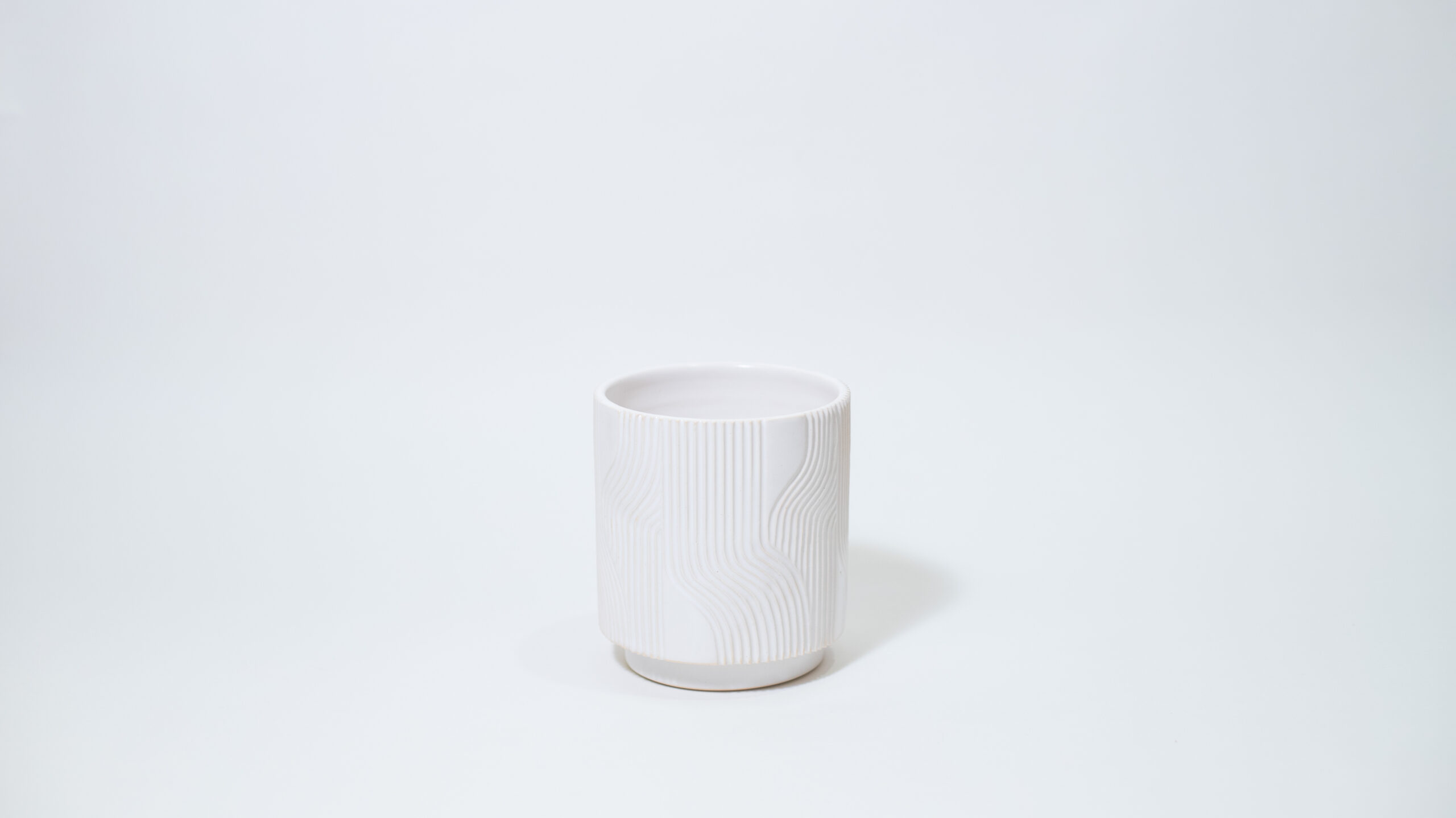 The exterior carved texture is completely hand-carved. The entire body is glazed in a white “Vanilla Bean” glaze with very slight brown speckles. The main plant pot body includes drainage holes and a separate drainage tray, but can also accommodate a standard 4″ nursery pot.